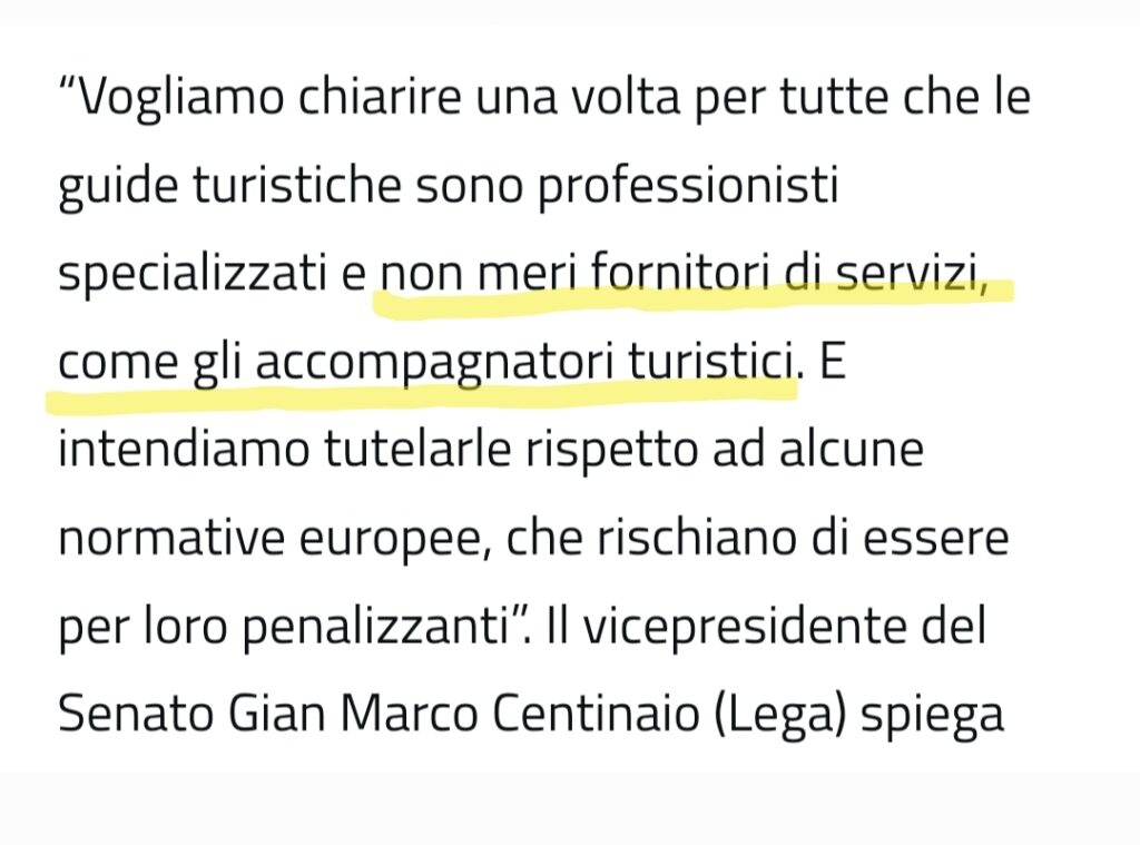 Ma come fare a giustificare una proposta che l’intero staff giuridico del Ministero del Turismo reputa impossibile non solo da approvare ma anche da presentare?Prendendosela, in un’intervista rilasciata al portale AGENZIACULT.IT, con gli Accompagnatori turistici, secondo lui “meri fornitori di servizi”.